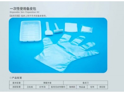 本產品由主要配置:膜手套、和選用配置:包布、衛生紙、滑石粉、海綿刷、物品盒、醫用無布敷料、紗布塊組成。產品應無菌,經環氧乙烷滅菌后環氧乙殘量應不大于10ug/g.一次性使用