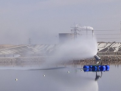 浮動(dòng)式霧化蒸發(fā)裝置安裝于蒸發(fā)塘水面上,廢水通過增壓泵送至高速旋轉(zhuǎn)的葉輪進(jìn)行無規(guī)則破碎,破碎成 30-300μm 的水霧粒子漂浮在空氣中,增加了水粒子與空氣的接觸面積,形成霧圖“懸浮時(shí)間”,利用空氣中的熱量和空氣的流動(dòng)性,強(qiáng)制提高蒸發(fā)效率。