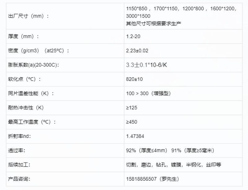 高硼硅玻璃0.2毫米-25毫米,最大尺寸3000*1500,最小尺寸不限。